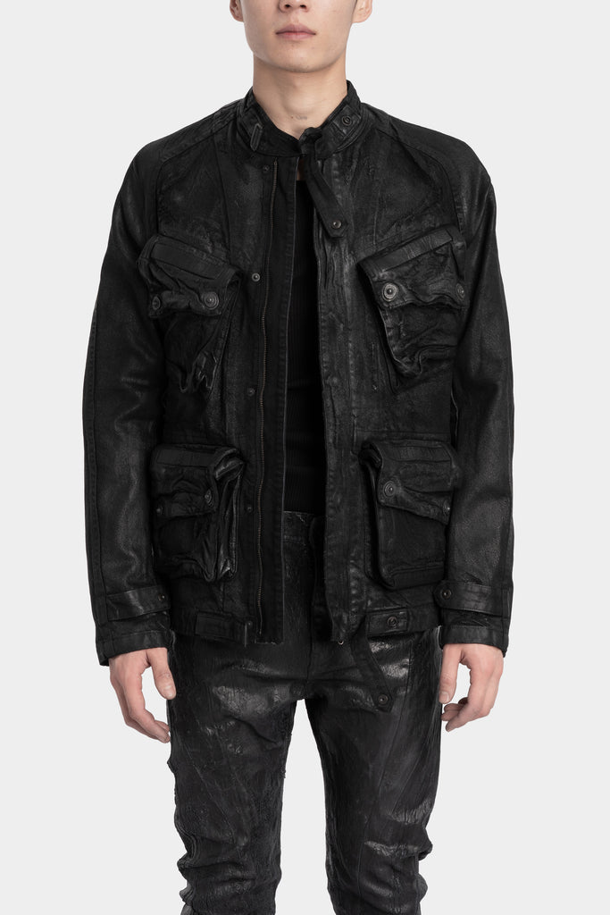 Men’s black coated, standing collar denim jacket featuring four cargo pockets in the front from the AW25/26 collection from Julius.