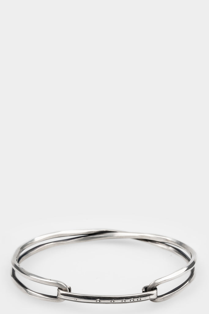 Unisex, crossed bangle bracelet in brushed and oxidised silver, from Werkstatt München.