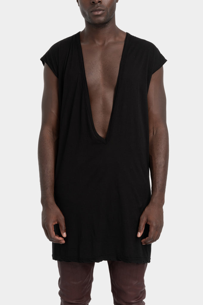 Men's black lightweight cotton sleeveless deep V-neck T-Shirt in lightweight organic cotton from Rick Owens DRKSHDW SS26 "Temple".