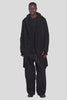 Men’s black hooded wool coat featuring an asymmetrical front button closure, scar-stitch seams and raw cut hem from the AW25/26 collection from Masnada.