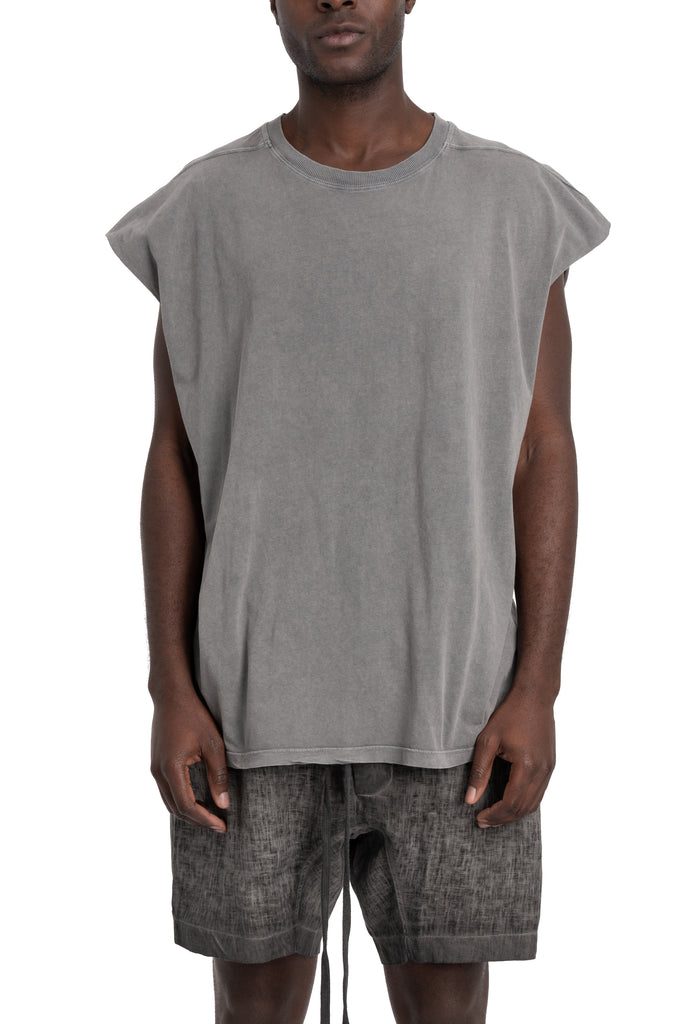 Men's washed grey cotton tee featuring raw cut off sleeves and off-white scar-stitch details in the back from the SS26 collection from Thom Krom.