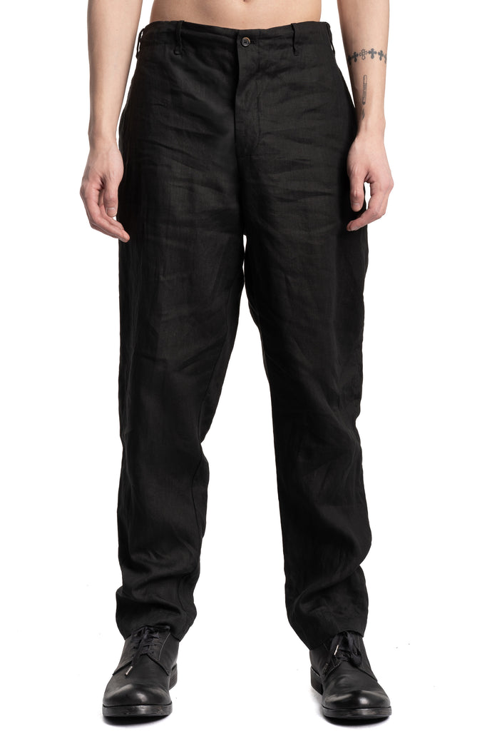 Men's pull-on trousers in lightweight woven linen featuring a relaxed tapered fit, elasticated back waistband and button fly closure from Forme D'Expression SS26.