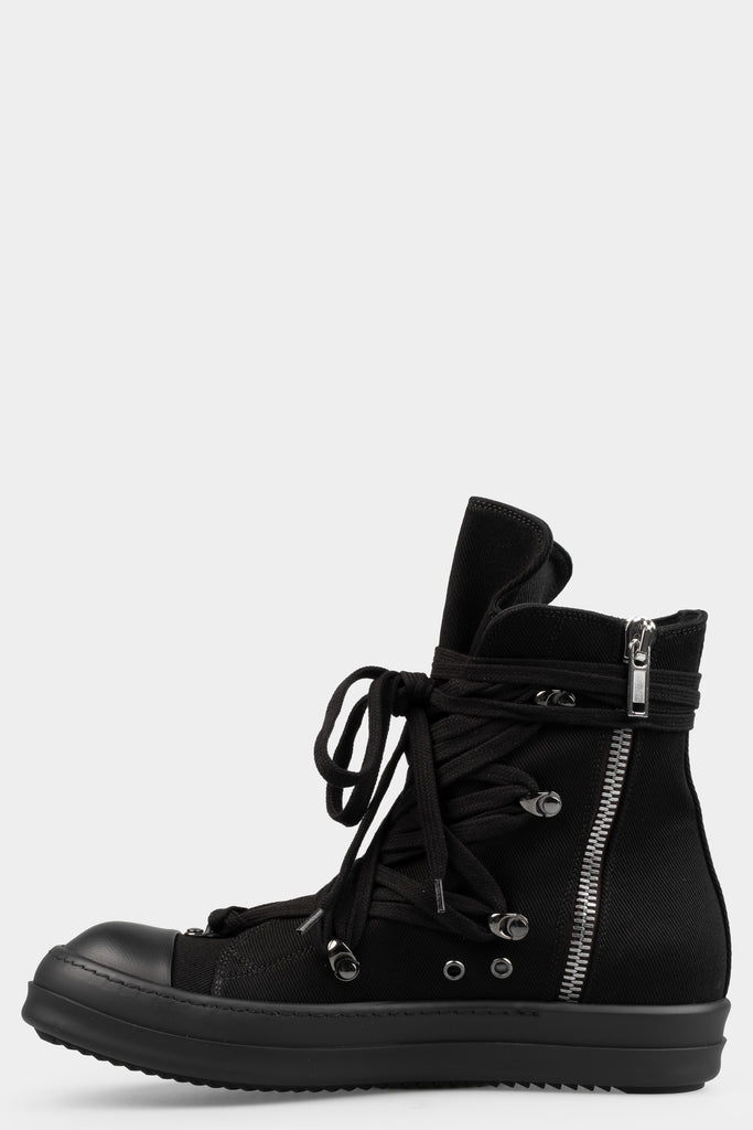 Men's mega-lace hexagram Ramones sneakers in black overdyed 13oz denim with black jagged sole from the AW25 collection "Concordians" from Rick Owens DRKSHDW.