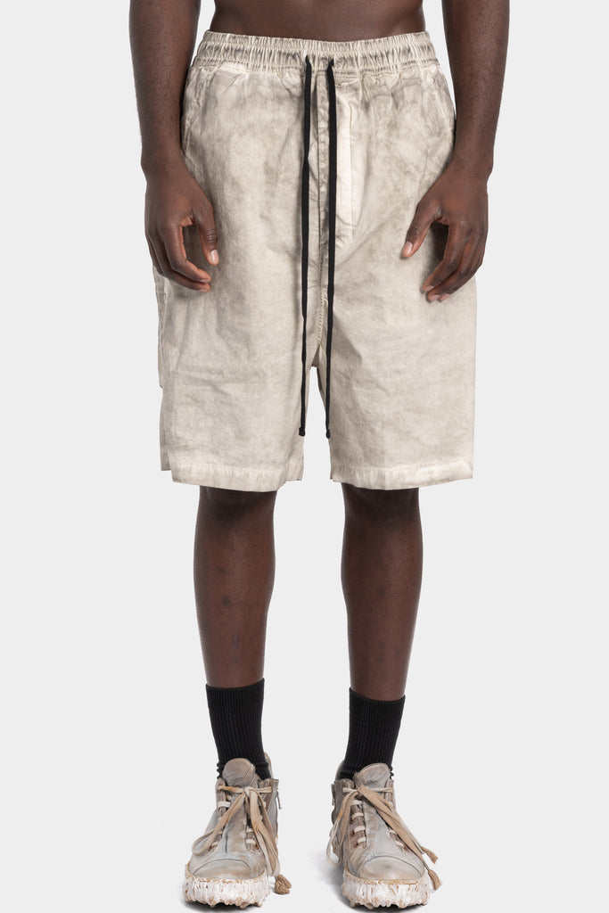 Men's cold dyed grey / beige drawstring shorts in lightweight cotton poplin featuring press button details on outer sides from the SS26 collection from Thom Krom.