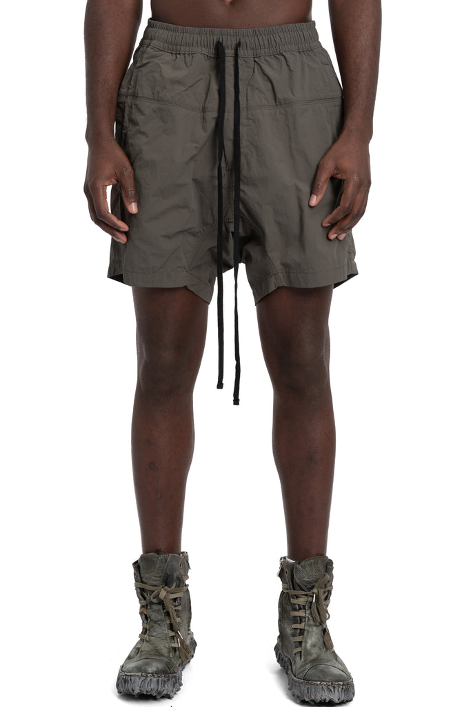 Men's crushed nylon short in color "olive earth" featuring black drawstrings from the SS26 collection from Thom Krom.